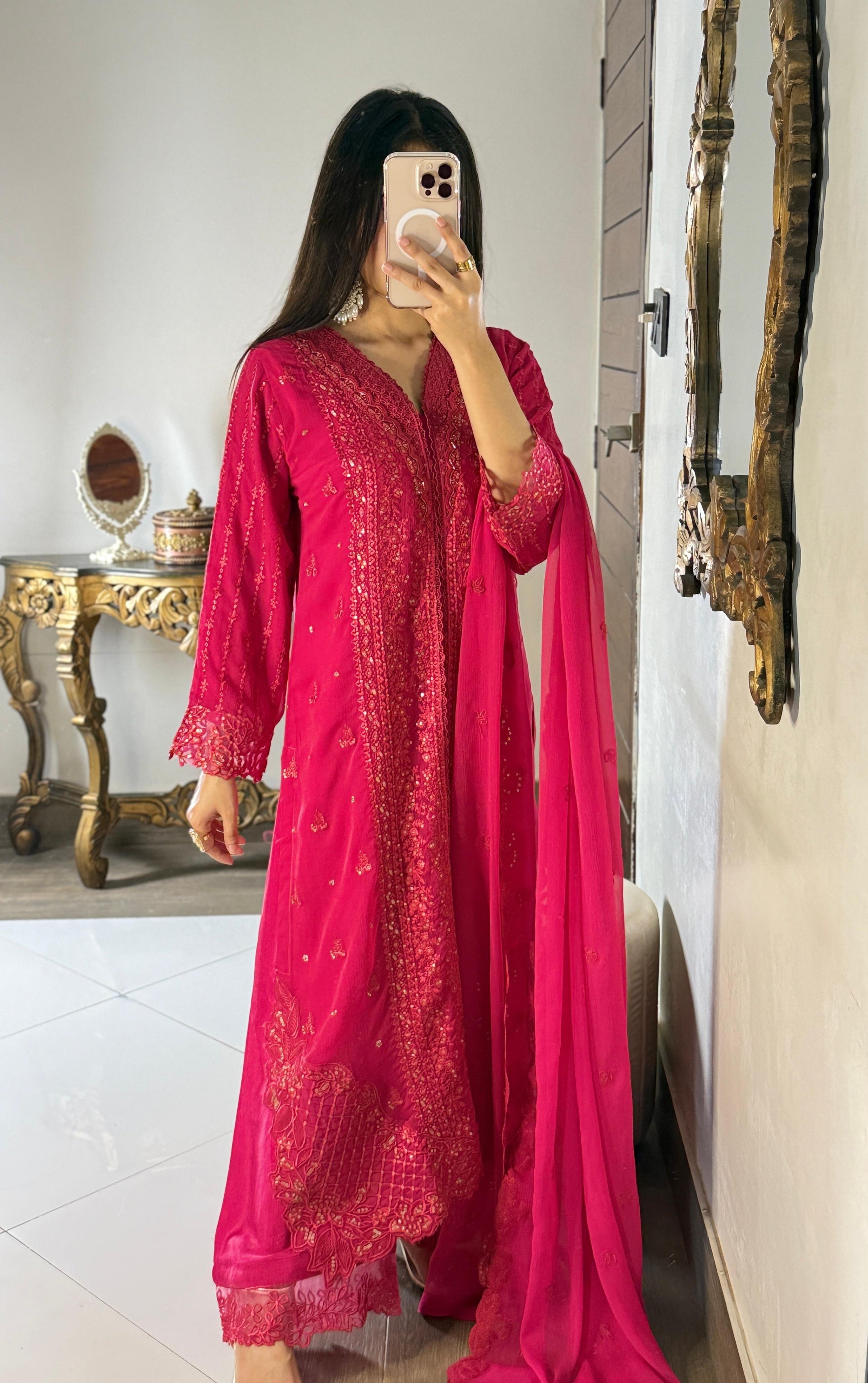 Elevate your festive wardrobe with this breathtaking 3-piece ensemble. Drenched in a bold, luxurious magenta hue, this outfit combines intricate traditional craftsmanship with a contemporary silhouette. The shirt features heavy, shimmering embroidery across the front, complemented by delicate applique work on the neckline, sleeves, and daman.