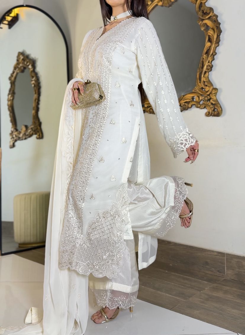 Pearl Ivory Chiffon 3-Piece Suite – Heavily Embroidered with Raw Silk Plazo