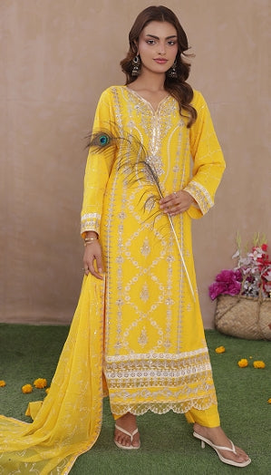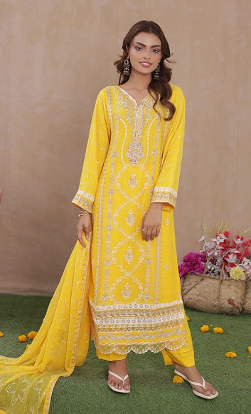 Sadabahar Chiffon 3-Piece Festive Suit - Luxury Embroidered Sunshine